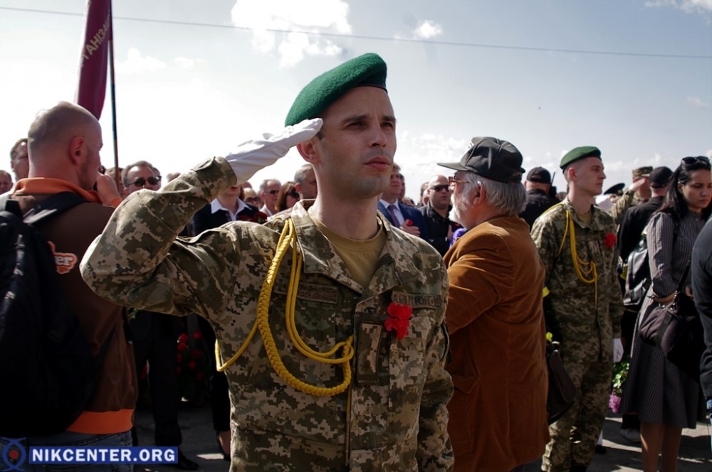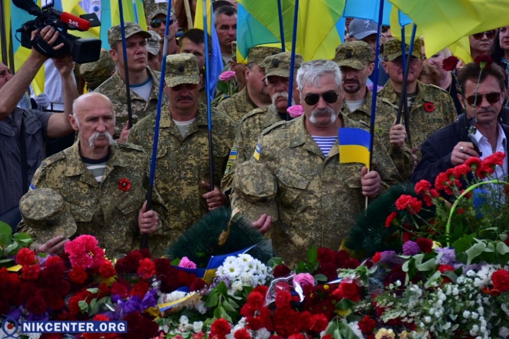 На набережную Парка Славы, где прошел праздничный митинг, херсонские участники АТО пришли с плакатом «Херсонщина против фашизм. Гитлер = Путин».