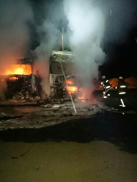 По указанному адресу выехали отделения 3 и 4 Государственных пожарно-спасательных по охране Ингульского и Заводского районов. По прибытию установлено, что горят кабины автомобилей и существует угроза опрокидывания огня на салоны. Спасательными подразделениями подано пенные стволы на тушение пожара, в 2:36 локализовано ее и в 2:49 полностью ликвидирован на общей площади 20 кв.м. Силами пожарных спасено от уничтожения полуприцепы грузовых автомобилей. К тушению привлекались 2 единицы техники и 5 человек личного состава.