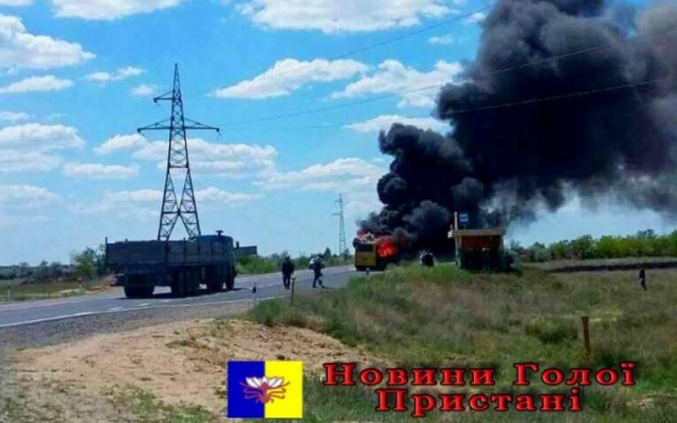 Вчера, 24 мая, произошел пожар на трассе Олешки — Голая Пристань. Возле автобусной остановки с. Правые и Левые Солонцы загорелся рейсовый автобус Херсон-Октябрьское.