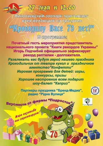 В субботу, 27 мая, Николаевский зоопарк приглашает всех желающих на праздник «Крокодилу Васе 70 лет!».