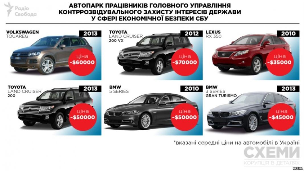 Ряд работников Главного управления контрразведывательной защиты интересов государства в сфере экономической безопасности СБУ пользуются дорогими автомобилями класса люкс, стоимость которых может быть несоизмеримой с заработной платой государственных служащих. Некоторые из зафиксированных автомобилей официально принадлежат не работникам СБУ, а их родителям, которые имеют небольшие официальные доходы, говорится в расследовании программы "Схемы", совместного проекта Радио Свобода и телеканала «UA: Первый».