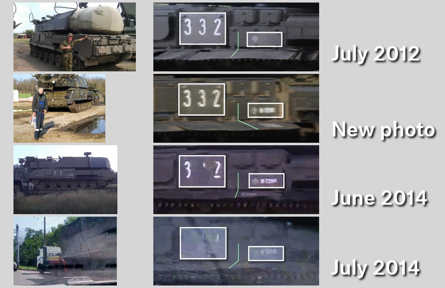 "Команде Bellingcat удалось обнаружить недостающее звено — фотографию, на которой видны маркировки негабаритного груза на Буке 332, снятую до его транспортировки в колонне в июне 2014 года. На фотографии, снятой российским механиком, вероятно, весной 2013 года, виден Бук 332 с теми же белыми транспортными маркировками, что были видны на нем в Украине незадолго до и вскоре после сбития MH17. Эта фотография Бука 332, на которой полностью виден бортовой номер, а также маркировки негабаритного груза, — последняя по времени съемки из обнаруженных нами, снятых до его транспортировки в колонне в июне 2014 года, когда вторая цифра бортового номера была уже закрашена", — сообщает Bellingcat.