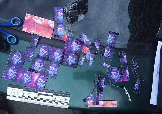 Во время поверхностного осмотра 18-летнего реализатора психотропов, полицеские изъяли у него синтетическое психотропное вещество LSD в виде марок количеством 615 штук.