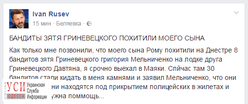 Как только мне позвонили, что моего сына Рому похитили на Днестре 8 бандитов зятя Гриневецкого — Григория Мельниченко на лодке друга Гриневецкого Давтяна, я срочно выехал в Маяки.Там 30 бандитов стали кидать в меня камнями и заявил Мельниченко, что они нас кончат. Они находятся под прикрытием полицейских в жилетах и на джипах. Нужна помощь, — сообщил директор нацпарка "Тузловские лиманы" Иван Русев.