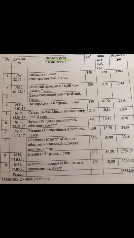 Во время обсуждения телепрограммы в соцсетях «всплыл» и такой факт, что освещение деятельности главы облсовета Владислава Мангера также обходится бюджету недешево. Депутат облсовета Матрина Чернышова даже разместила соответствующий «прейскурант».