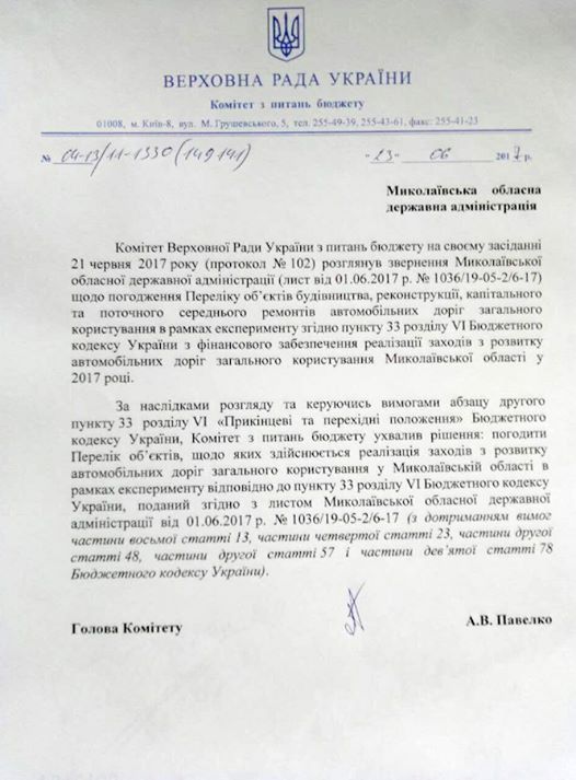 Официально получили документальное подтверждение, что бюджетный комитет Верховной Рады согласовал перечень дорог, предложенный Николаевской ОГА, который будет проводиться за счёт средств, полученных от «таможенного эксперимента». Надеюсь, что наши дорожные службы быстрее смогут осуществить все необходимые процедуры и начнут ремонтные работы на этом направлении».