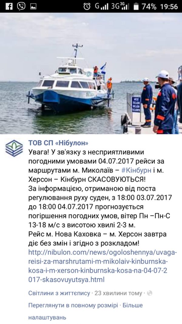 Из-за неблагоприятных погодных условий 4 июля рейс катера на подводных крыльях по маршруту Херсон-Кинбурн отменяется.