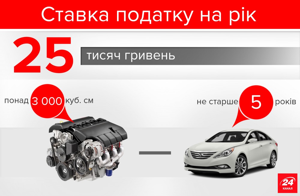 Следует отметить, что в 2017 году транспортный налог платят владельцы легковых автомобилей с датой выпуска не больше 5 лет и стоимостью свыше 375 минимальных заработных плат, независимо от объема двигателя. Ставка транспортного налога в 2017 году составляет 25 тыс. гривен.