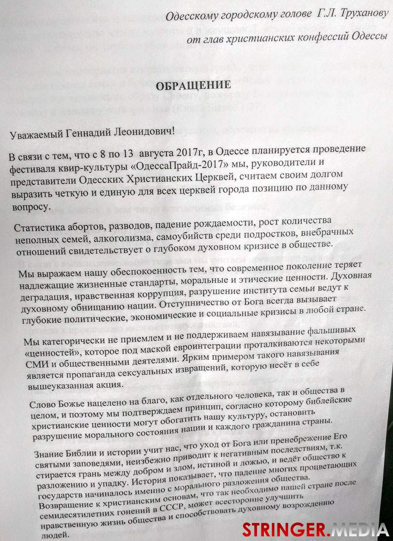 Священнослужители Одессы обратились к градоначальнику Геннадию Труханову не допустить в городе проведения гей–прайда, заявленного на 8–13 августа. Об этом сообщает Risu.ua.