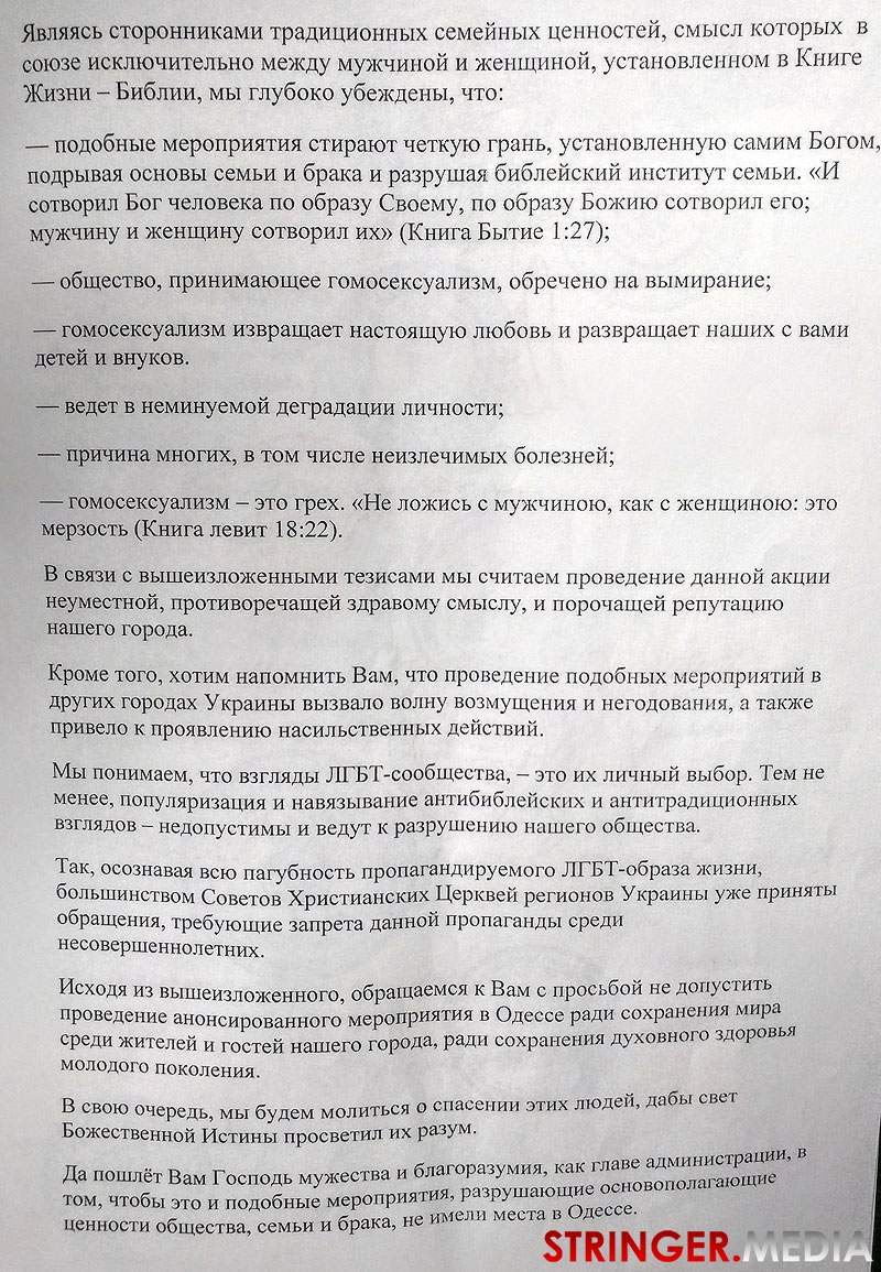 «Мы категорически не воспринимаем и не поддерживаем навязывание фальшивых "ценностей", которые под маской евроинтеграции проталкиваются некоторыми СМИ и общественными деятелями. Ярким примером такого навязывания является пропаганда сексуальных извращений, которую несет в себе вышеуказанная акция. Мы считаем проведение этой акции неуместной, противоречащей здравому смыслу и порочащей репутацию нашего города», — сказано в обращении.