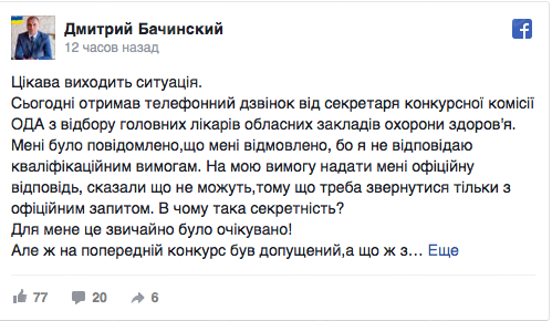 Причем сообщили об этом Д.Бачинскому вчера, 9 августа, по телефону, о чем конкурсант, который участвовал в первом конкурсе на должность главврача Николаевской областной больницы, написал на своей странице в Фейсбук.