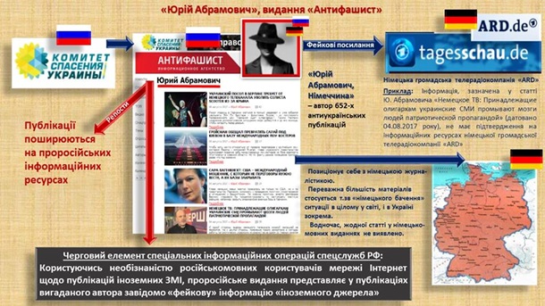 "В поле зрения оперативников спецслужбы попал некий "журналист" Юрий Абрамович, который постоянно публикуется на пророссийском информационном ресурсе "Антифашист", и его последний "шедевр" "Немецкое ТВ: Принадлежащие олигархам украинские СМИ промывают мозги людям патриотической пропагандой". В статье говорится о якобы репортаже (на самом деле отсутствует) немецкой общественной телерадиокомпании ARD о методах работы украинских журналистов", — отметили в СБУ.