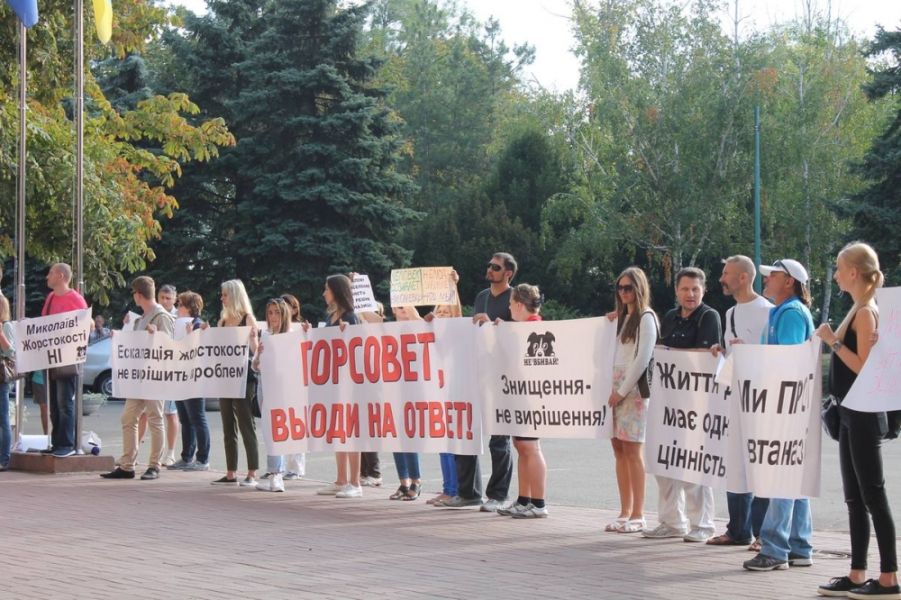 Утром 8 сентября возле Николаевского городского совета собрались митингующие против эвтаназии бездомных животных.