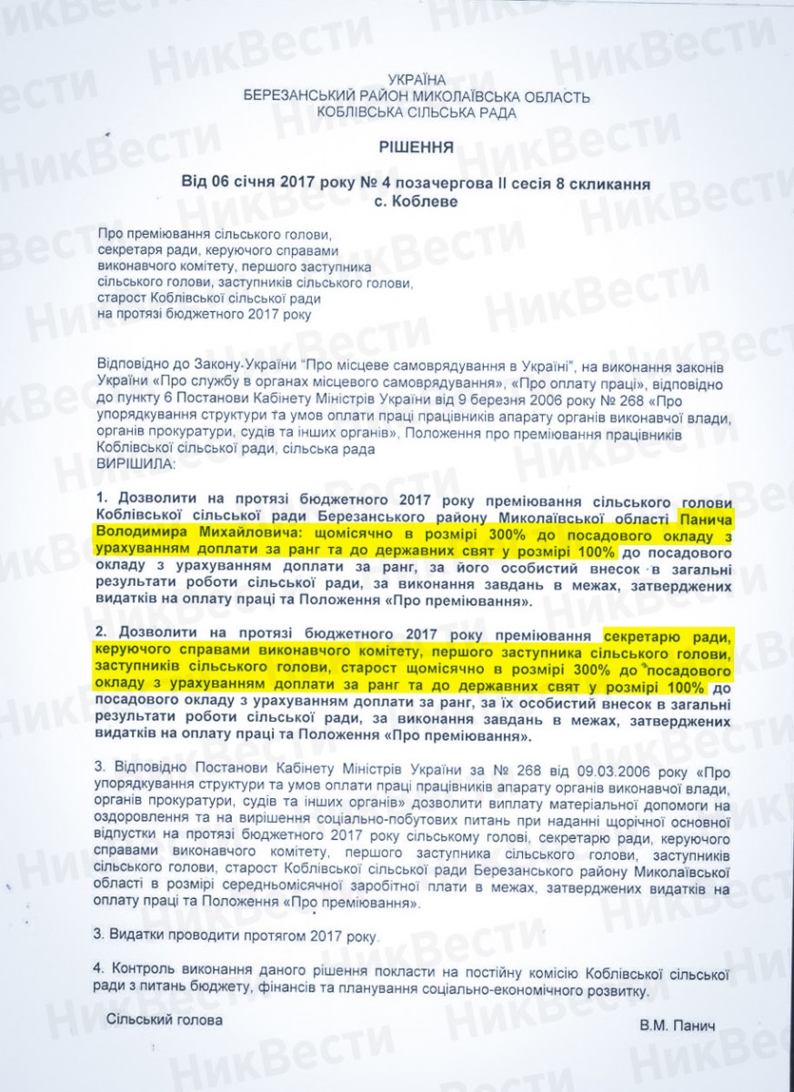 — Вот решение второй внеочередной сессии Коблевского сельсовета. Оно называется так: «О премировании сельского головы, секретаря, руководящего делами исполнительного комитета, первого заместителя сельского головы, заместителей» и так далее. «Разрешить на протяжении бюджетного 2017 года премировать голову сельского совета Коблевского сельсовета Панича Владимира ежемесячно в размере 300% к должностному окладу с рангом» и так далее «и к государственным праздникам 100%». Это первый пункт. Второй: «Разрешить на протяжении бюджетного 2017 года премировать секретаря, руководящего делами исполнительного комитета, первого заместителя сельского головы, заместителей, старост ежемесячно в размере 300% к должностному окладу и 100% к оплате за ранг», — зачитал Алексей Сидорчук.