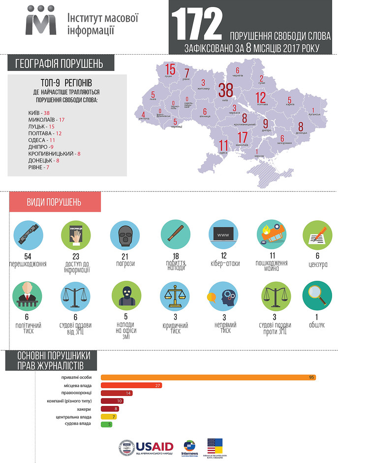 Так, всего в Украине с начала года зафиксировано 172 случая нарушений прав журналистов. Из них 17 приходится на Николаевскую область. На первом же месте оказались Киев и Киевская область с показателем 38 случаев. Третье место с 15-ти случаями заняла Волынская область.