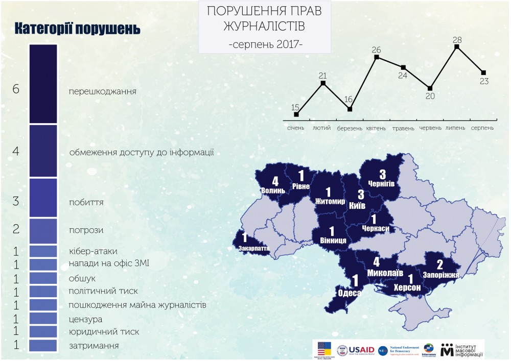В то же время с начала года зафиксировано увеличение случаев ограничения доступа к информации и угроз журналистам. В частности, эксперты ИМИ зафиксировали 23 случая ограничения доступа к информации (эта категория заняла второе место). За тот же период прошлого года было зафиксировано 18 таких случаев.