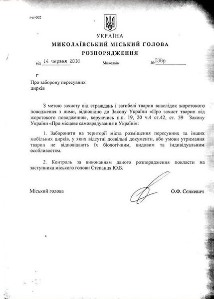 Издание Nikolaev24 отмечает, что 14 июня городской глава Александр Сенкевич подписал распоряжение, согласно которому в Николаеве запрещается размещение «привозных и других мобильных цирков, у которых отсутствуют разрешительные документы или условия содержания животных, которые не отвечают их биологическим, видовым и индивидуальным особенностям». Изначально, к Сенкевичу обращались с просьбой полного запрета использования зверей в цирках, но мэр решил вопрос несколько иначе. Не смотря на это, цирки до сих пор продолжают гастролировать.