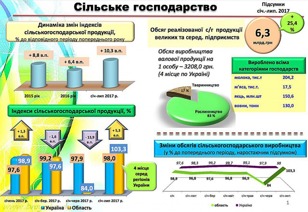 Отмечается рост растениеводства – 105,4%, доля которого в общем объеме составляет 83%. По объему производства продукции сельского хозяйства на душу населения область также занимает 4-е место с показателем – 3208 гривен.