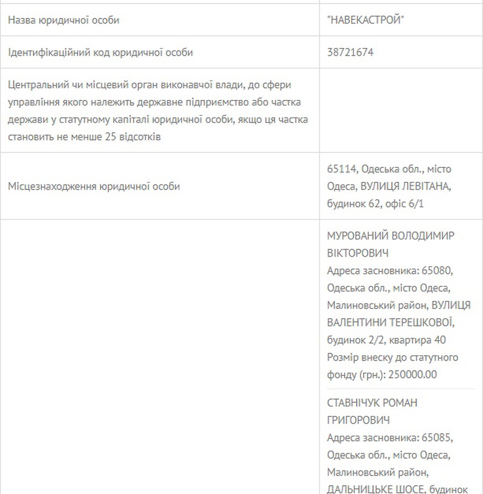 Согласно единому реестру юридических лиц, физических лиц-предпринимателей и общественных формирований ООО «Навекастрой» принадлежит Владимиру Мурованому и Роману Ставничуку. Оба неоднократно фигурировали в СМИ как помощники депутата Беляевского районного совета Петра Киссе.