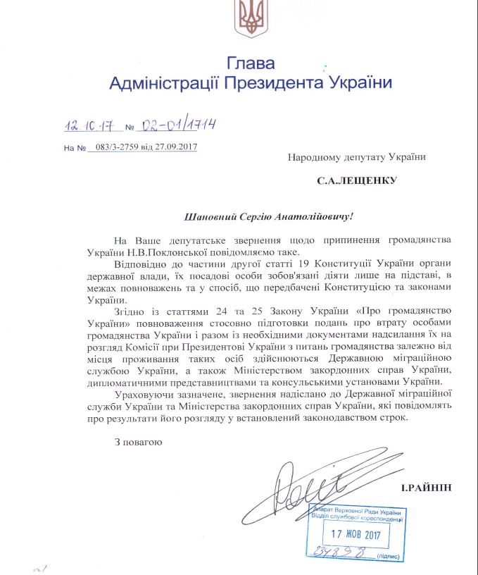 "В частности, АП отвечает на вопрос нардепа о том, лишали ли гражданства Поклонскую. Из письма становится понятно, что ни миграционная служба, ни министерство иностранных дел, ни другие дипломатические учреждения не присылали президенту представление о лишении Поклонской украинского гражданства", — пишет издание.