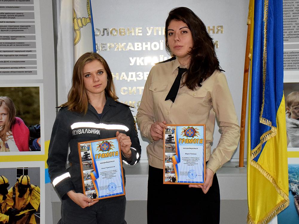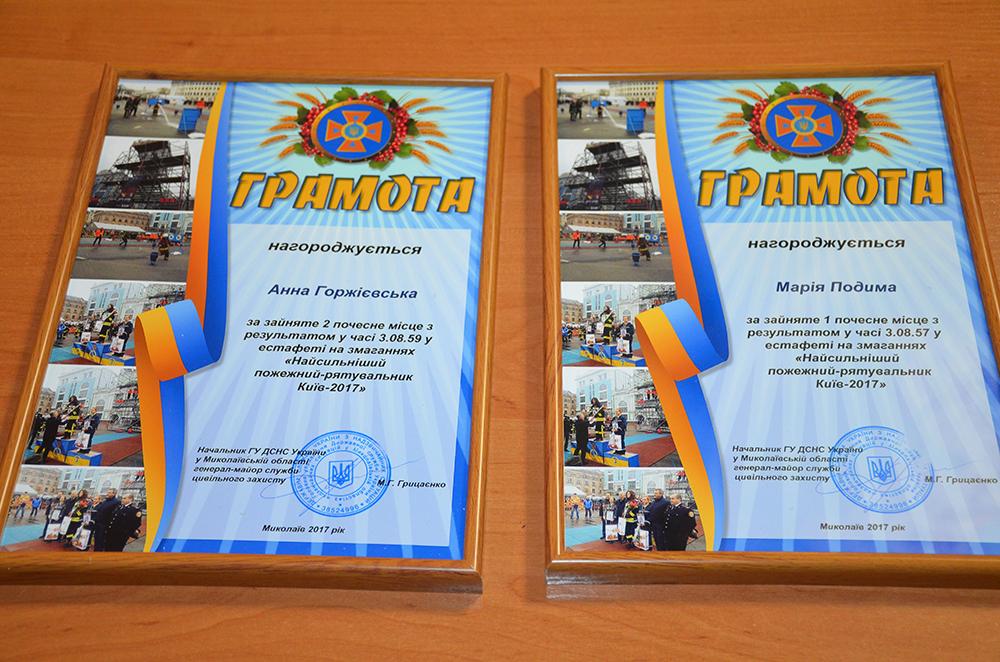 Две сотрудницы Главного управления ГСЧС Украины в Николаевской области Мария Подима и Анна Горжиевская заработали победу в Международных соревнованиях пожарно-спасательных служб "Сильнейший пожарный-спасатель Киев-2017", также известных в мире как "Firefighter Combat Challenge".