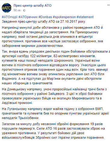 На приморском направлении, которое последние несколько дней оказалось в эпицентре противостояния, противник все чаще применяет вооружение, которое запрещено мирными договоренностями: "Так, вчера днем (27 октября — Ред.) в течение нескольких часов боевики обстреливали из артиллерии калибра 122 миллиметра, 82-миллиметровых минометов, пулеметов наши позиции неподалеку Широкино. Украинские воины огнем с пехотного вооружения отвечали врагу".