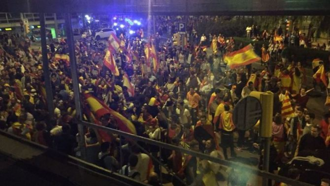 Протестующие с испанскими флагами, среди которых присутствовали футбольные фанаты, после завершения мирной части митинга против "независимости" Каталонии устроили нападение на студию радиостанции Catalunya Ràdio, созданной правительством региона, и журналистов телеканала BTV.