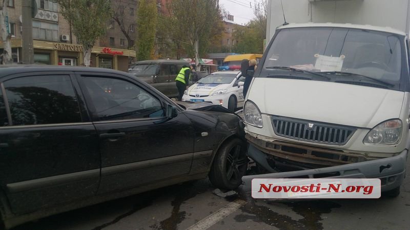 Днем в среду, 8 ноября, на проспекте Мира в Николаеве столкнулись автофургон ГАЗель, легковой автомобиль Mercedes и патрульный автомобиль полиции Toyota Prius.