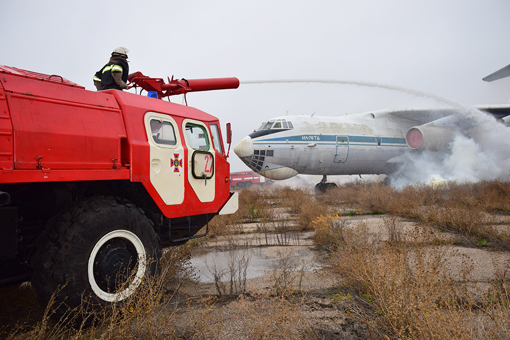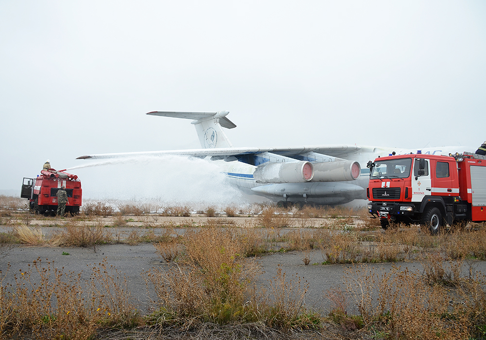 По тактическому замыслу, во время условной посадки самолета ИЛ-76 ТД возник пожар. На место происшествия прибыла пожарная команда объекта. Пожарные подали специальные стволы на тушение условного пожара, локализовав и ликвидировав его в короткий срок.