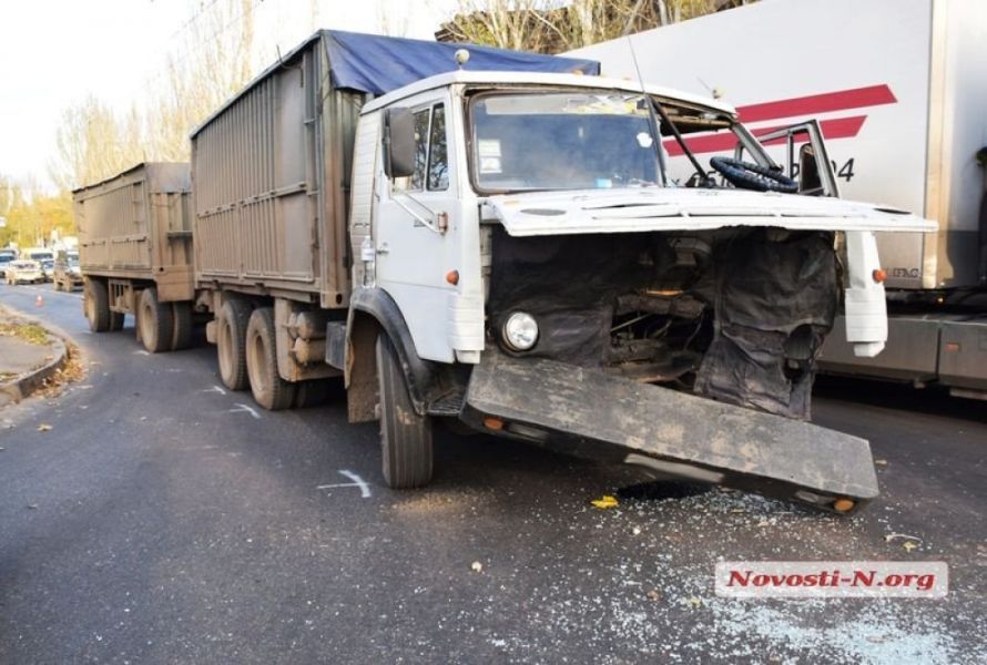 В среду, 15 ноября, на пересечении ул. Пушкинской и Никольской в Николаеве столкнулись грузовик «КамАЗ» с двумя прицепами и седельный тягач DAF с цистерной.