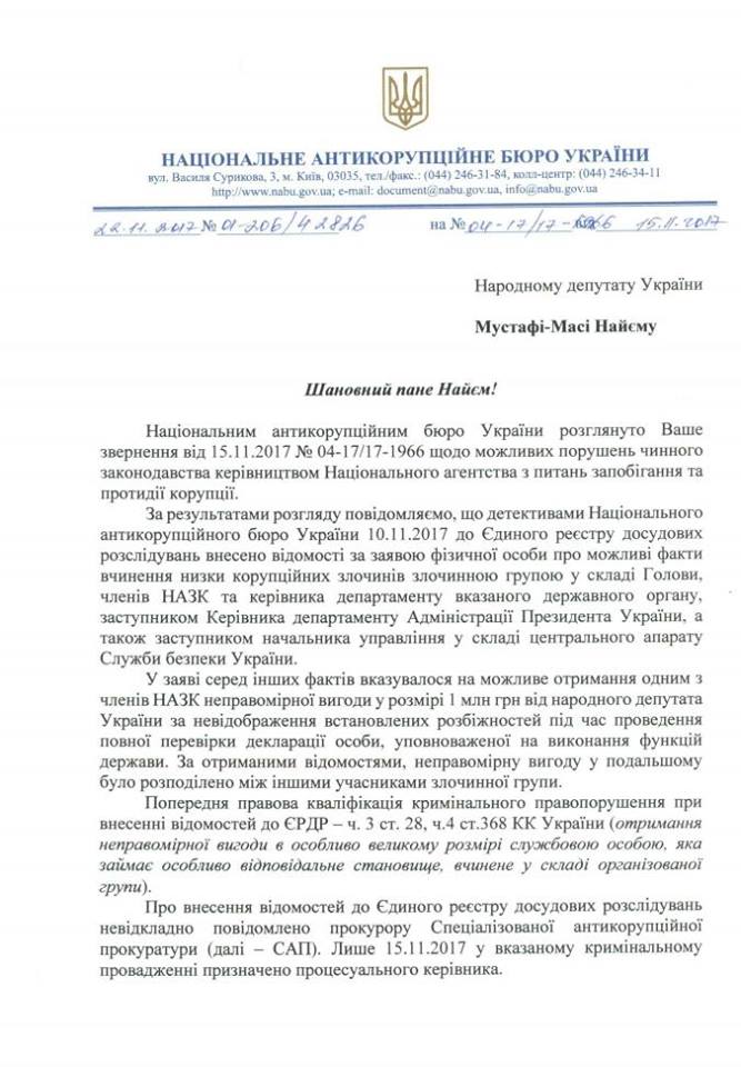 Детективы НАБУ 10.11.2017 в ЕРДР внесли сведения по заявлению физического лица о возможных фактах совершения ряда коррупционных преступлений преступной группой в составе главы, членов и руководителя департамента НАПК, заместителем руководителя департамента АП, а также заместителем начальника управления в составе центрального аппарата СБУ", — говорится в письме.