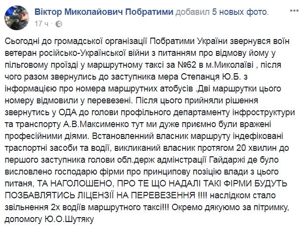В общественную организацию «Побратими України» обратился воин, ветеран российско-украинской войны с вопросом об отказе ему в льготном проезде в маршрутном такси за №62 в Николаеве», — написал Сюрченко.
