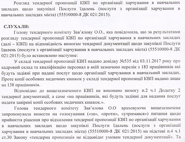 Тендерный комитет управления образования Николаевского городского совета не допустил до аукциона по закупке услуг питания детей в учебных учреждениях трех участников из четырех, в результате чего торги должны быть отменены. Одесская фирма, допущенная до торгов, заподозрила КОП и гороно в сговоре и требует допустить КП по питанию детей к аукциону.