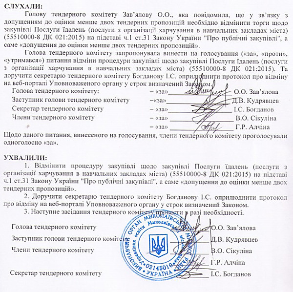В результате рассмотрения документов, тендерный комитет управления образования до аукциона допустил только одну фирму – одесское ООО «ПРОД-ЮГ». В связи с этим, есть вероятность того, что торги на закупку питания в школах и детсадах Николаева будут отменены, так как согласно закону «О публичных закупках», в случае, если до аукциона допускается только один участник, то торги объявляются снова.