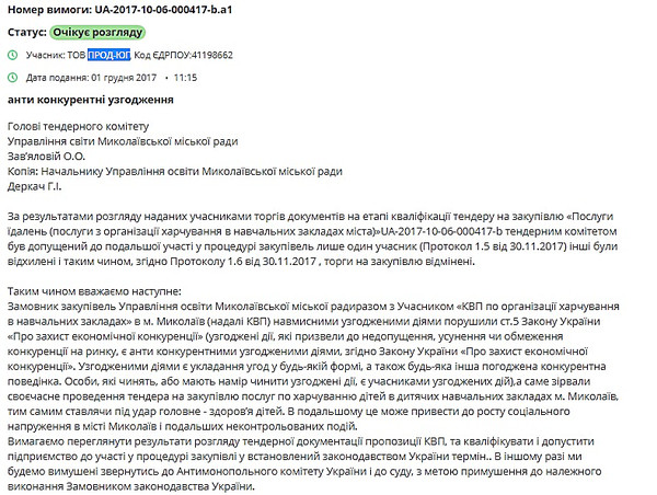 Заказчик закупок Управление образования Николаевского городского совета вместе с Участником «КОП по организации питания в учебных заведениях» в г. Николаев (далее КОП) умышленными согласованными действиями нарушили ст.5 Закона Украины «О защите экономической конкуренции» (согласованные действия, которые привели к недопущению, устранению или ограничению конкуренции на рынке, является антиконкурентными согласованными действиями, согласно Закону Украины «О защите экономической конкуренции». Согласованными действиями является заключение соглашений в любой форме, а также любое другое согласованное конкурентое поведение. Лица, которые оказывают или намерены оказывать согласованные действия, являются участниками согласованных действий), а именно сорвали своевременное проведение тендера на закупку услуг по питанию детей в детских учебных заведениях Николаева, тем самым ставя под удар главное — здоровье детей. В дальнейшем это может привести к росту социальной напряженности в городе Николаеве и последующим неконтролируемым событиям. Требуем пересмотреть результаты рассмотрения тендерной документации предложения КОПа, и квалифицировать и допустить предприятие к участию в процедуре закупки в установленный законодательством Украины срок. Иначе мы будем вынуждены обратиться в Антимонопольный комитет Украины и в суд, с целью принуждения к надлежащему исполнению Заказчиком законодательства Украины», — говорится в требовании «ПРОД-ЮГ».