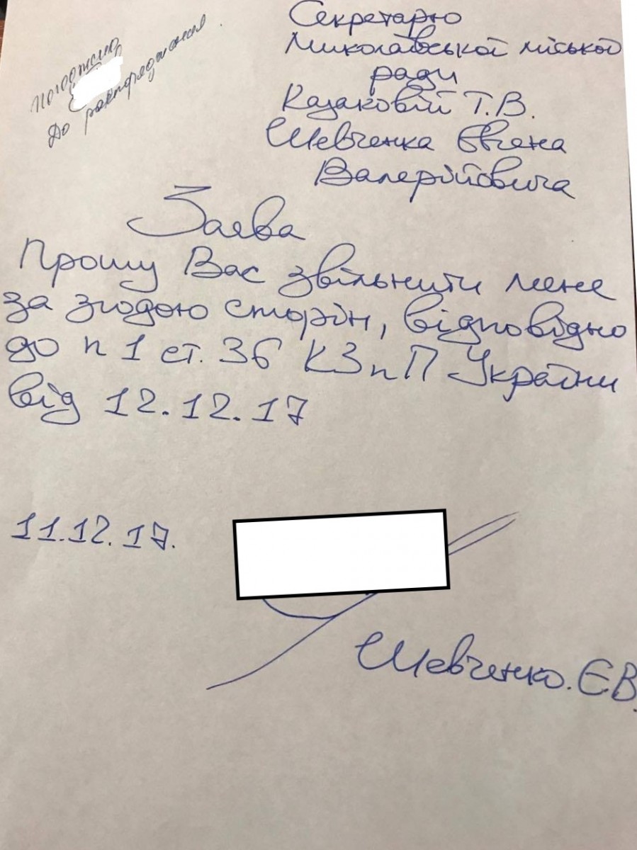 "Прошу вас уволить меня по соглашению сторон, в соответствии с п.1 ст . 36 КЗоТ Украины от 12.12.2017", – говорится в заявлении.