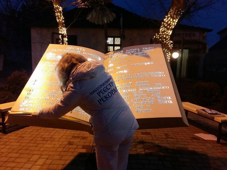 И снова Доброслав. Представитель Национального реестра рекордов Украины Лана Ветрова измеряет Книгу Заповедей. И это очередной рекорд — «Самая большая инсталляция «Книги Заповедей» в Украине.