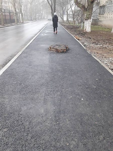 «Высший пилотаж дизайнерской мысли при обустройстве дорог и тротуаров в Николаеве по улице Китобоев: пень есть пень, и пусть так и останется, а деревья – можно асфальт вокруг и ботинками притоптать, зачем бордюрами заморачиваться. И главное – ведь работы кто-то принял, и акты подписал, и деньги перечислил», — написал горожанин.