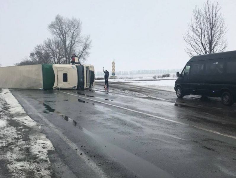 Авария произошла на территории Вознесенского района между с. Белоусовка и с. Дорошовка. По предварительной информации, из-за плохого сцепления на дороге водитель не справился с управлением и фура перевернулась.