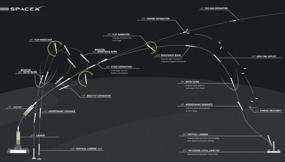 Через две минуты после старта два боковых ускорители отделились от основной ракеты, а уже через несколько минут синхронно приземлились возле места запуска на посадочные площадки LZ-1 и LZ-2, расположенные в 300 метрах друг от друга.