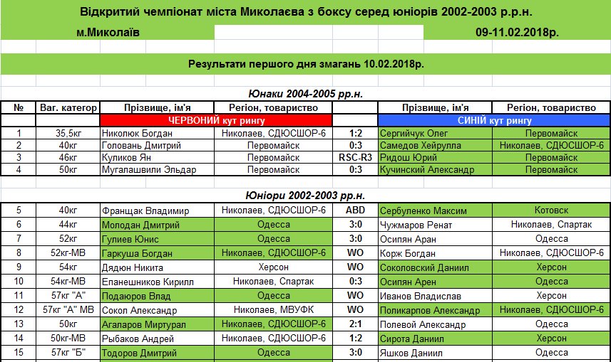 В Николаеве 9 и 10 февраля проходил Открытый чемпионат города по боксу среди юношей 2002-2003 г. р. Приятно, что эти соревнования вызвали живой интерес у любителей бокса. Конечно же, во втором зале николаевской СДЮСШОР № 6 по боксу принимали участие в награждении победителей известные боксеры нашего города. Это мастер спорта СССР, заслуженный тренер Украины Виктор Запорожец, заслуженный мастер спорта Украины Олег Машкин, мастера спорта международного класса Виталий Волков, Александр Ключко и Сергей Ковганко.