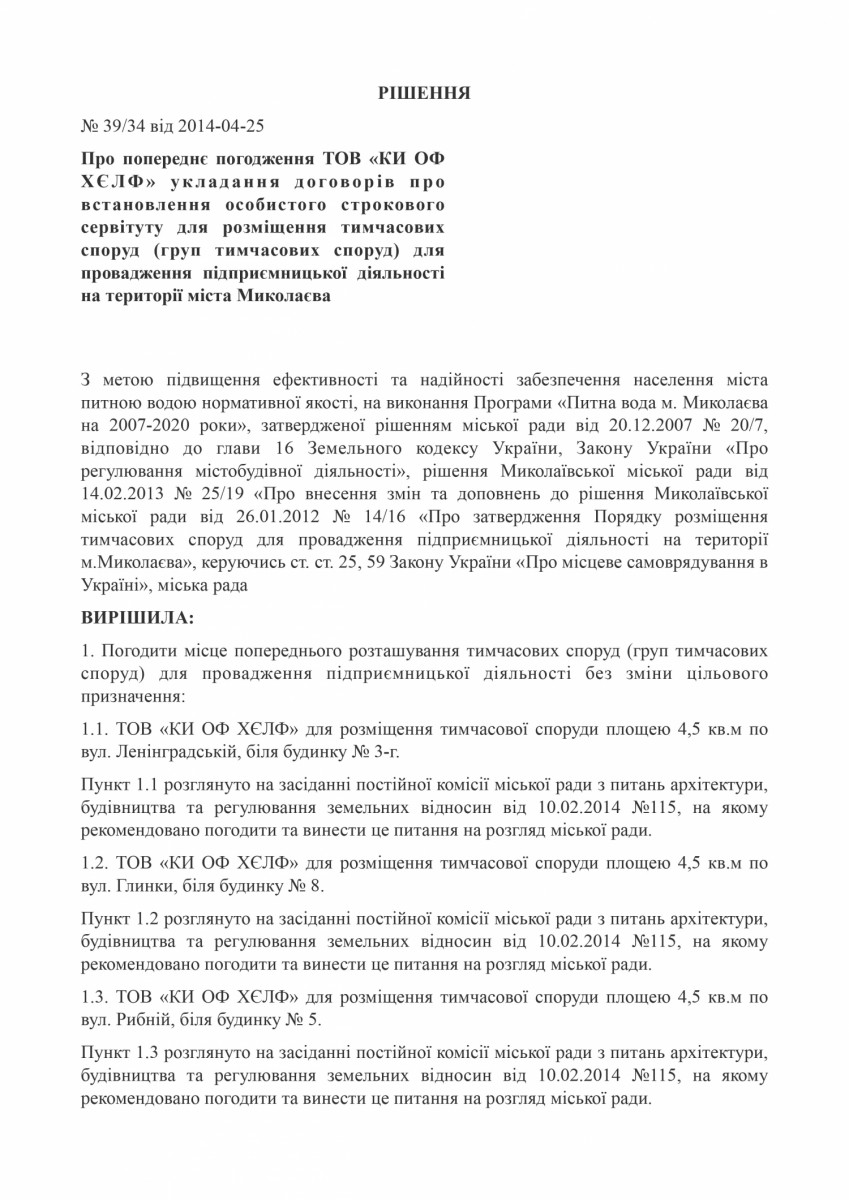 Комиссия по вопросам упорядочения размещения объектов торговли и сфер услуг на территории Николаева приняла решения по сносу 38-ми киосков по продаже питьевой воды «Живая вода» компании «КИ ОФ ХЭЛФ».