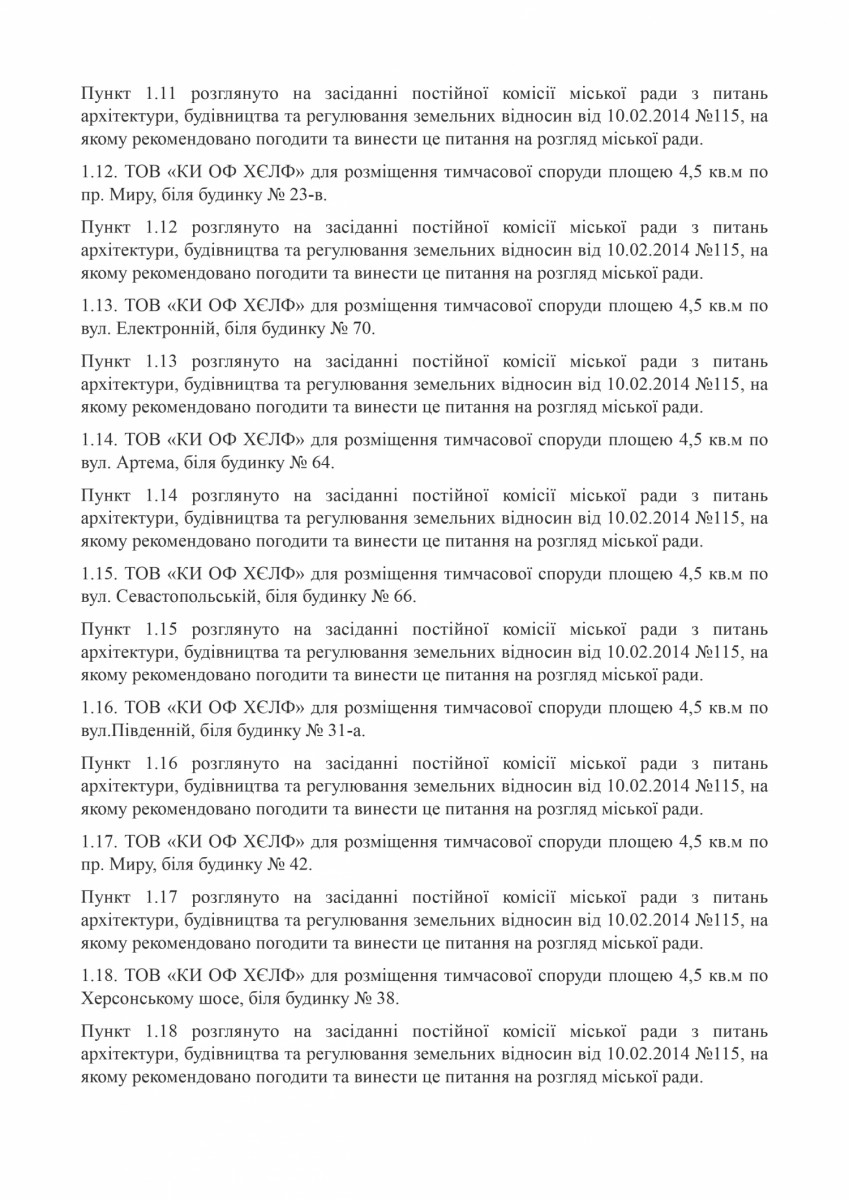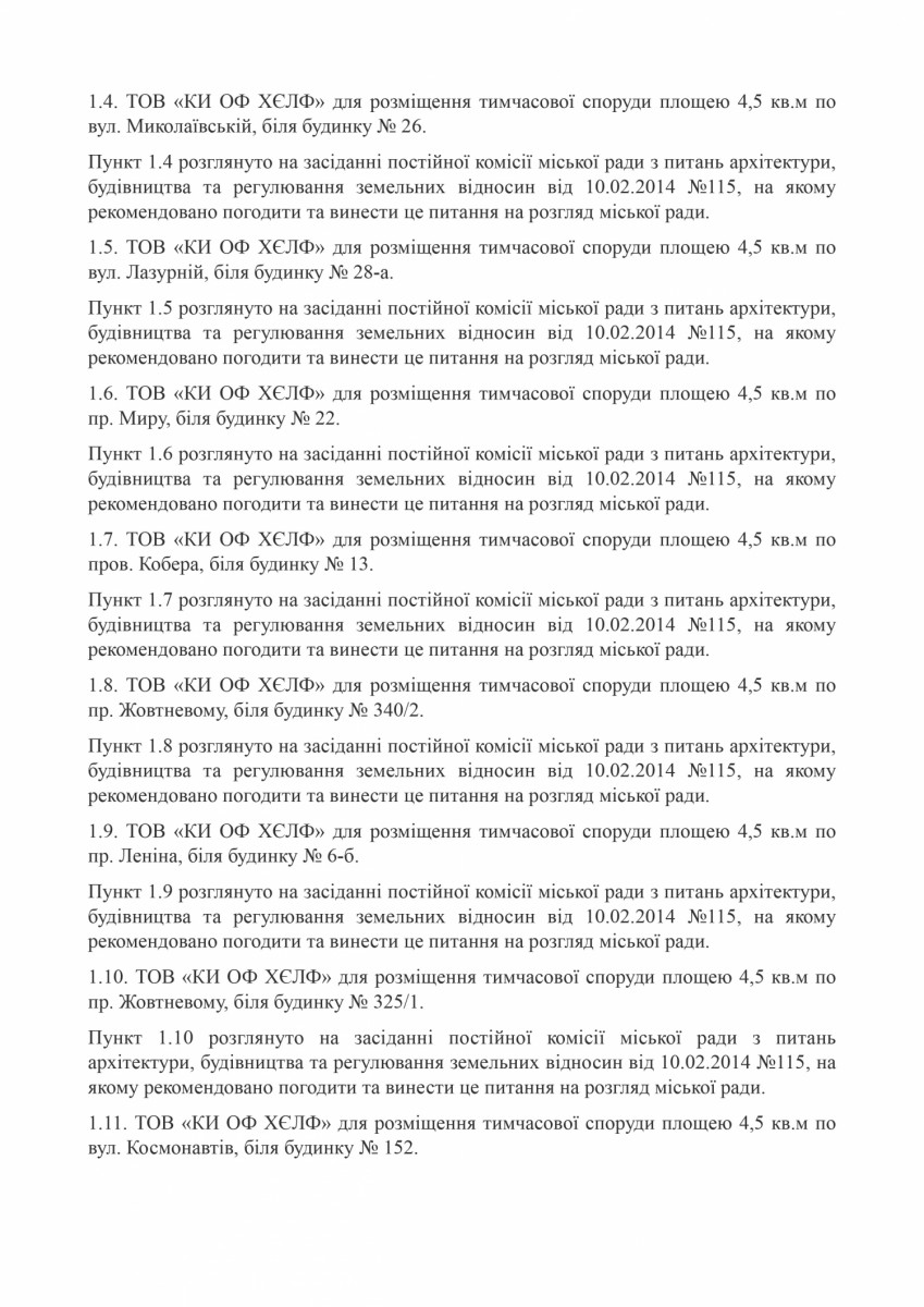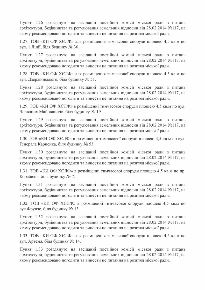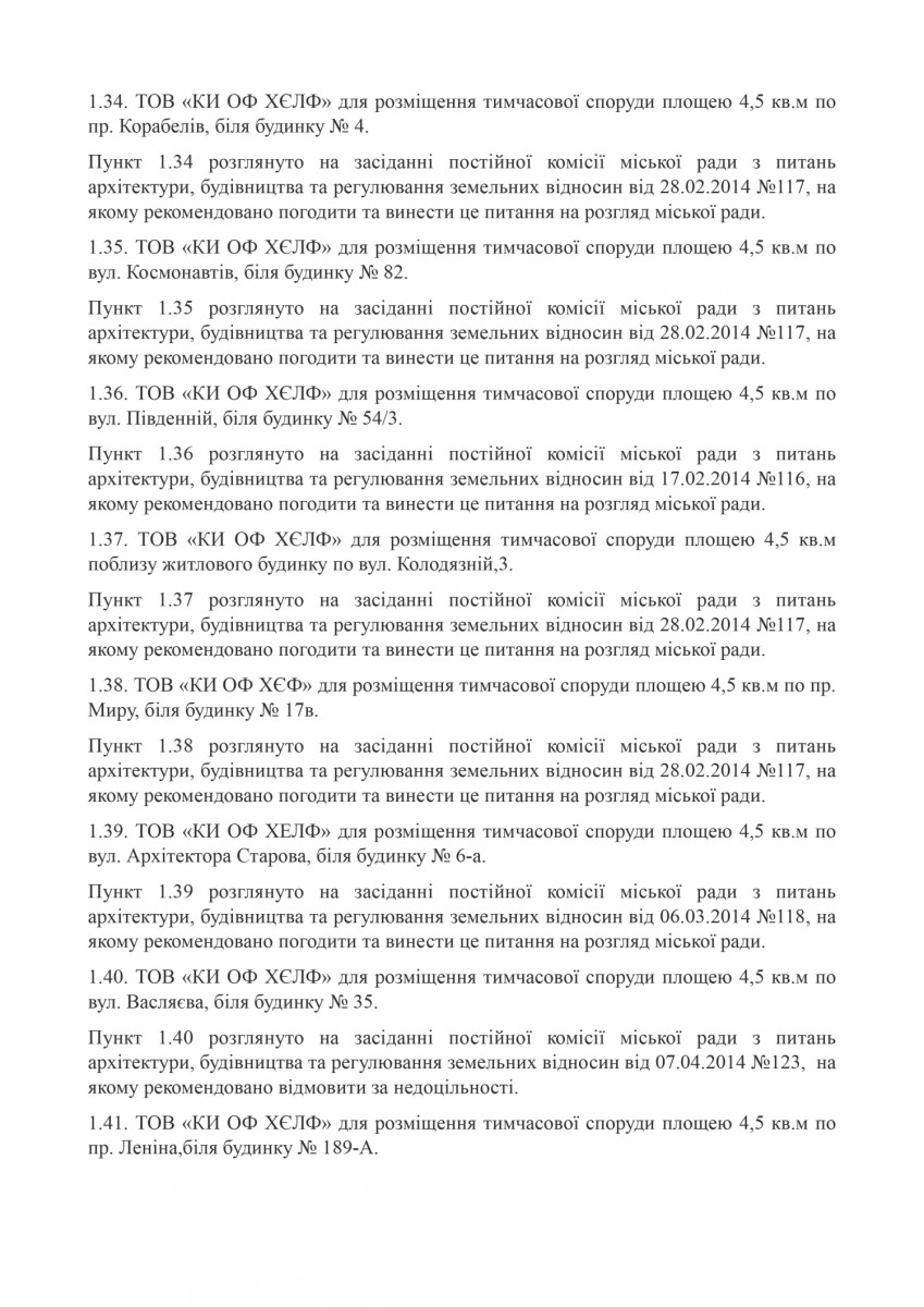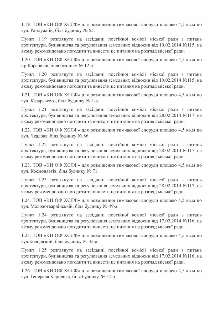 Незаконно размещенные киоски находятся по адресам: улица Декабристов, 40; проспект Мира, 66; проспект Мира, 58; проспект Богоявленский, 127; улица Веселенивская угол улицы Очаковской; улица Очаковская, возле дома 17; улица Никольская, 4; улица Крылова, 46; улица Пограничная, 244; улица Чайковского, 31А; Одесское шоссе, возле дома №86; улица Очаковская, возле дома №179; улица Южная 39; проспект Богоявленский, 28; улица Пограничная, 80; улица Пограничная угол улицы 1 Слободская; улица Озерная, 29; улица Китобоев 82 угол улицы Космонавтов; улица Космонавтов 69; улица Крылова 15; улица Кузнецкая, 50; улица Космонавтов, 126/1; улица Космонавтов, 128; улица Космонавтов, 142; улица Белая, 2А; улица Озерная, №25; улица Курортная, №9; улица Первомайская, 111; улица Херсонское шоссе, 46; проспект Центральный, 261; улица Скульптора Измалкова угол улицы Китобоев; улица Космонавтов, 68 А; улица 295 Стрелковой дивизии, 4; улица Ольжича, 3 Г; улица Океановская, 28; улица Океановская, 32; ул. Океановская, 30-а; улица Глинки, 6.