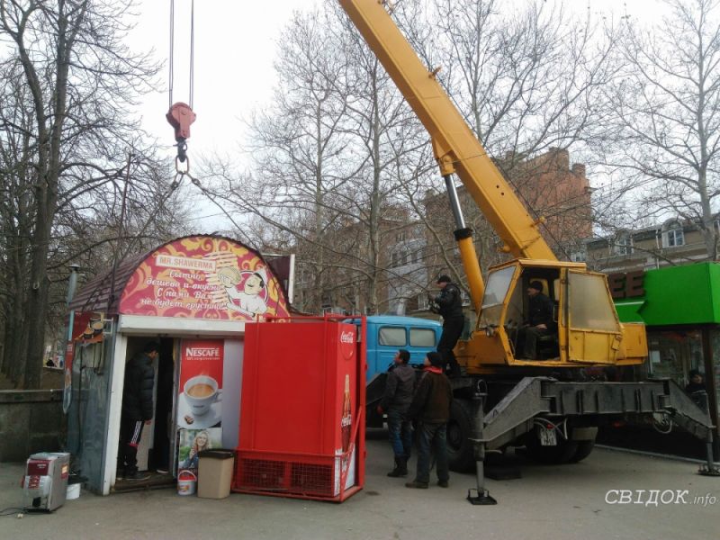 На предупреждения предприниматели не отреагировали, потому в ход пустили «тяжелую артиллерию». Принудительный демонтаж начали с будки шаурмы на пересечении Соборной и Большой Морской.