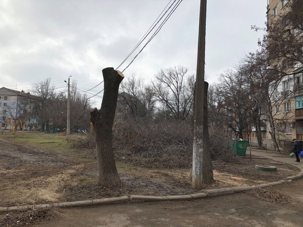 В Николаеве, во дворе жилого дома обрезали деревья, оставив только стволы.