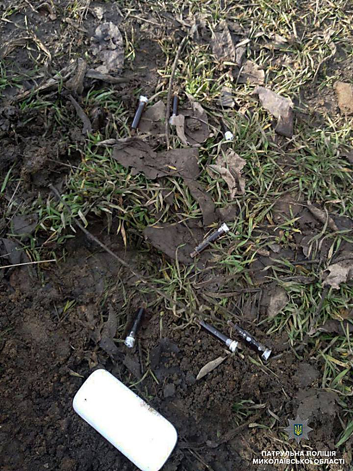 В Корабельном районе Николаева 9 марта около 09:00 патрульные полицейские остановили автомобиль «ВАЗ-2107» за нарушение водителем правил дорожного движения. Из салона авто вышла пенсионерка и выбросила 50 шприцов с веществом бурого цвета.