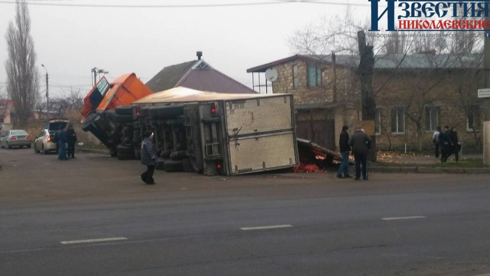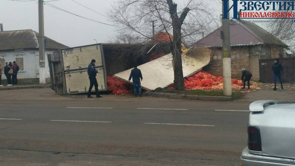 В Николаеве грузовик с луком врезался в забор дома и перевернулся