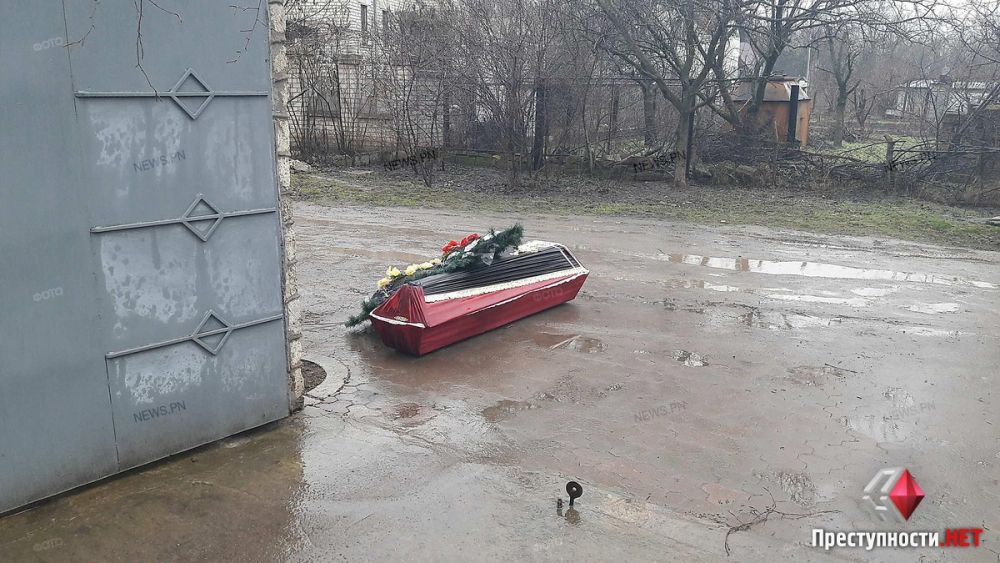 В пятницу утром, 16 марта, николаевский бизнесмен Андрей Кривохижа обнаружил у ворот своего дома в Ингульском районе гроб со своей фотографией и венками.