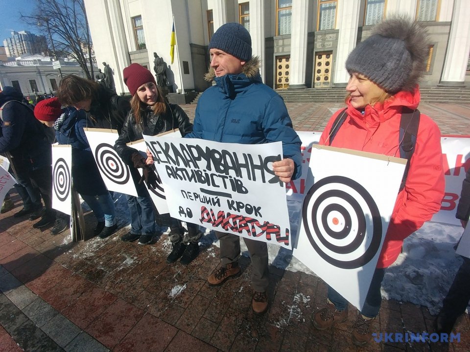 Сегодня, 19 марта, под зданием Верховной Рады находится около 20 правозащитников, которые надели на себя картонные мишени и требуют отмены для них Е-деклараций. Акция получила название "Активисты — не мишени". Об этом сообщает "Укринформ".