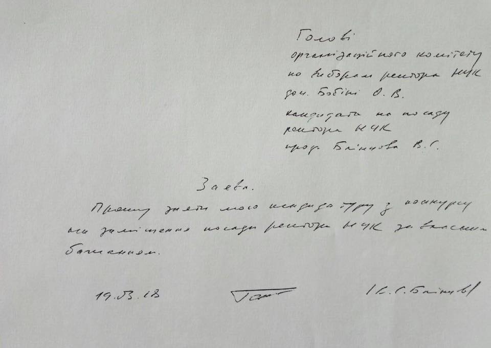 «Второй тур выборов ректора НУК имени адмирала Макарова состоится при участии одного-единственного кандидата — проректора университета Евгения Трушлякова, который в первом туре набрал более 47% голосов. Действующий и.о. ректора Владимир Блинцов, который по результатам выборов набрал второй после своего коллеги результат, сегодня написал заявление и снял свою кандидатуру с выборов», — написал Тарас Креминь и опубликовал фото.